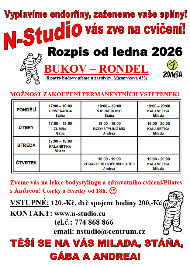 POZOR! Ve středu 26.března odpadá bodystyling od 18h a jóga od 19h, přijďte na kalanetiku od 17h!